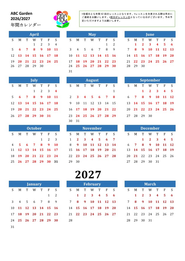 First Touch(FT) 対象:1〜2歳のお子様とママ 大好きなママと一緒に初めての英語にチャレンジ!歌やゲーム、クラフトなどの様々なアクティビティを通して自然に英語に触れていきます。 Growing Up(GP) 対象:2〜3歳のお子様 指先の発達に合わせたTPRやゲームにトライ!少しずつ発音練習にも力を入れていきます。 Blossom(BL) 対象:3〜4歳のお子様 アクティビティを通して、アルファベットの基礎を作ります。またロールプレイを行うことで、今までに習った単語を実際に使っていきます。 Finders1・2(FI) 対象:4歳以上のお子様 アルファベットとフォニックス(発音)を学び、4つのスキル(聴く・話す・読む・書く)の基礎を作っていきます。 Builders1・2(BU) 対象:6歳以上のお子様 4つのスキルをさらに伸ばすとともに、いつもの先生以外の人を招き、会話をする機会を設けることで子供たちが自信をつけられるようにしていきます。
